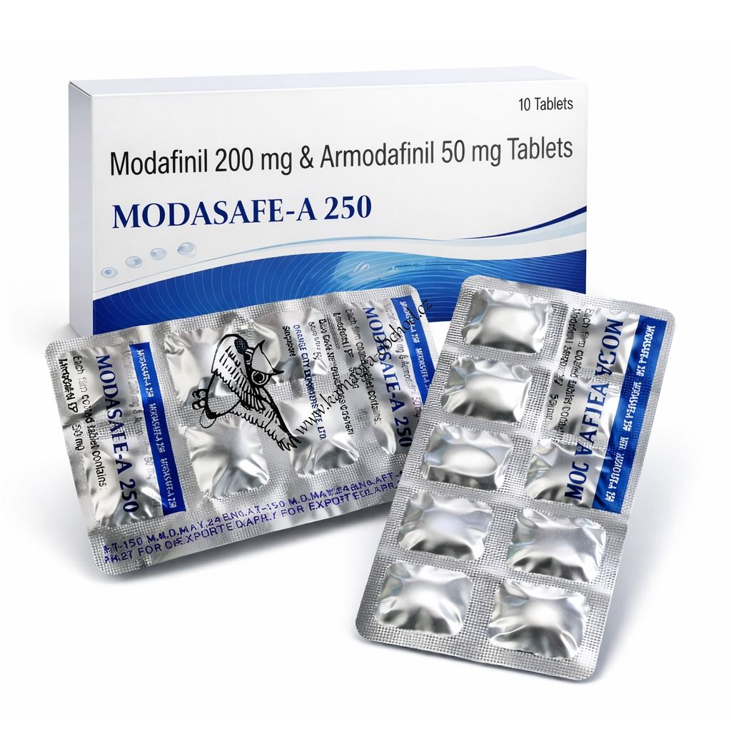 Modasafe 250mg je vysoce kvalitní generikum, díky kterému jeho uživatelé dosáhnou požadovaného vrcholu soustředění, ostražitosti a zlepšení kognitivních funkcí.Chcete pracovat aktivněji a efektivněji během denní pracovní doby? Modasafe 250 je nejlepší lék, který zvyšuje bdělost a podporuje bdělost. Modasafe 250 obsahuje Modafinil 200 mg a Armodafinil 50 mg, které působí společně na léčbu nadměrné denní ospalosti zvané narkolepsie, která se vyznačuje nadměrnou denní ospalostí a krátkými mimovolními spánkovými epizodami. Používá se před pracovní dobou během dne. Stimuluje CNS, což způsobuje individuální upozornění při práci.